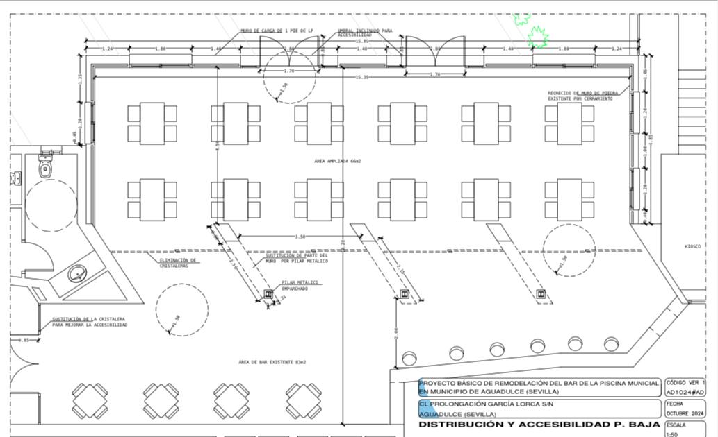 El proyecto de ampliación y mejora del bar de la piscina municipal de Aguadulce representa una inversión importante para ampliar y mejorar las instalaciones: se pretende mejorar la zona del comedor del bar de la piscina dotándola de mucho más espacio, remodelando los muros de carga actuales para liberar espacio y sustituyendo las cristaleras por puertas y ventanas abatibles, que además cumplirán con la normativa en accesibilidad.